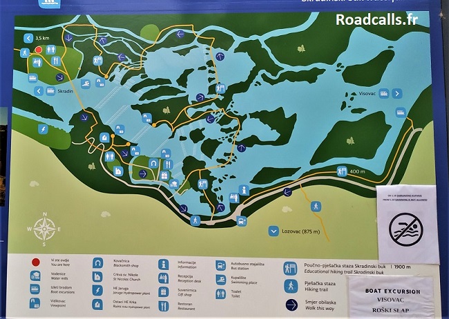 La zone touristique du parc de Krka comprend un circuit de découverte qui fait 1900 mètres. Il dessine une large boucle autour des cascades de « Skradinski buk ». C’est ce circuit que je vous présente dans les lignes qui suivent (il est matérialisé en rouge sur la carte artisanale que j’ai mise plus haut, et en jaune ci-dessous sur le plan officiel de Krka).