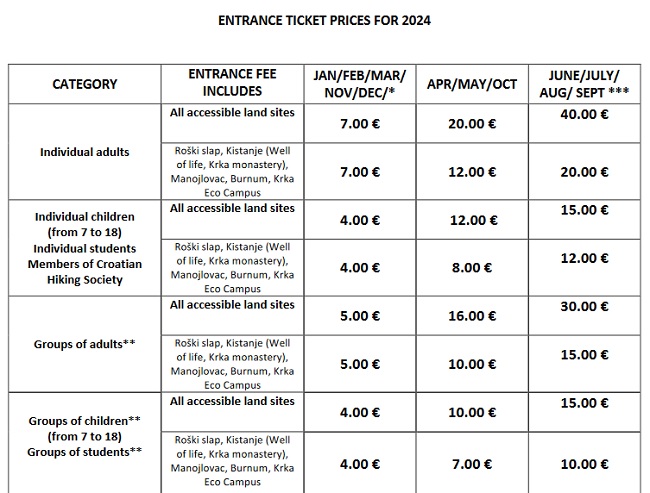 Les lignes tarifaires secondaires pour chaque catégorie, correspondant à Roski Slap, Kistanje, Manojlovac, Burnum et Pulanje (Krka Eco Campus), sont les points d’intérêt secondaires du parc national de Krka, dans le cas où vous décidez d’y accéder par vos propres moyens (de toute façon, il n’y a que Roski Slap qui soit accessible par les moyens du parc, à savoir un bateau qui remonte la rivière, et dont le coût actuel est de 20 euros ; les autres lieux se trouvent à une trentaine de kilomètres plus au nord et sont accessibles seulement avec votre voiture personnelle).