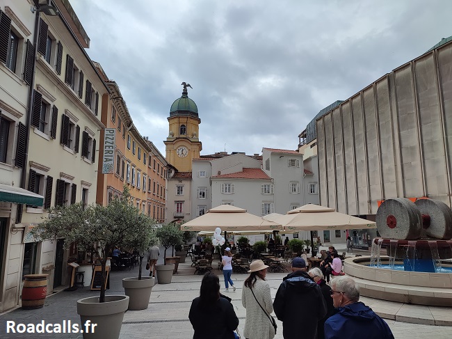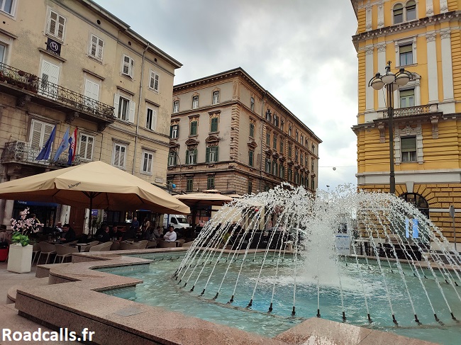 Juste de l’autre côté de la tour de l’horloge, une fois franchi le passage que je vous indiquais, vous trouverez une petite place paisible : Trg Ivana Koblera. Ici, plusieurs petites terrasses invitent à se prendre un café au calme, loin de l’agitation de Korzo, bercé seulement par le ronronnement de la fontaine. Alors, il faut quand même faire abstraction de la façade triste du centre commercial qui se trouve là, mais sinon c’est un endroit très sympa, à l’entrée du vieux centre de Rijeka.
